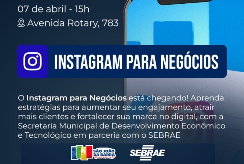 A Prefeitura de São João da Barra, em parceria com o Sebrae, está com inscrições abertas para a palestra básica sobre “O Instagram para Negócios”, que vai acontecer no dia 7 de abril, às 15h, na Sala do Empreendedor, que fica na Secretaria Municipal de Desenvolvimento Econômico e Tecnológico, localizada na Avenida Rotary, 783. As vagas são limitadas e os interessados podem garantir as participações através do link (aqui).